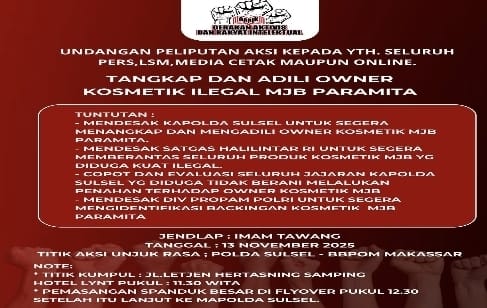 MAKASSAR, MATANUSANTARA — Sejumlah elemen masyarakat, aktivis konsumen, dan pengawas peredaran kosmetik menyampaikan keprihatinan mendalam atas maraknya penjualan produk kosmetik MJB Paramita yang diduga kuat ilegal dan berpotensi membahayakan konsumen. Mereka menilai lambatnya penindakan hukum telah menciptakan preseden buruk bagi perlindungan publik.