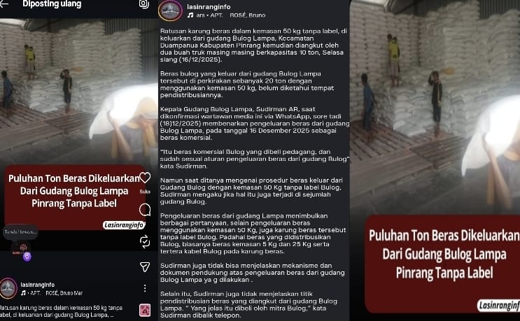 Dalam unggahan itu disebutkan, peristiwa terjadi Selasa siang, 16 Desember 2025. Judulnya bikin dahi berkerut: “Puluhan Ton Beras Dikeluarkan Dari Gudang Bulog Lampa Pinrang Tanpa Label.” Isinya lebih bikin mata melotot: beras Bulog keluar gudang pakai karung 50 kilogram tanpa satu pun identitas resmi Bulog.