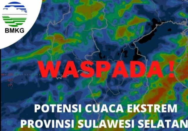 Badan Meteorologi, Klimatologi dan Geofisika (BMKG) Wilayah IV Makassar mengeluarkan peringatan dini cuaca ekstrem yang berdampak di 17 kabupaten dan kota di Sulawesi Selatan (Sulsel). Sejumlah daerah tersebut mesti waspada terhadap ancaman banjir hingga longsor.