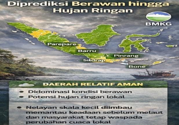 Wilayah yang diprakirakan berawan hingga hujan ringan tanpa indikasi ekstrem meliputi Kota Makassar, Parepare, Barru, Pinrang, Sidrap, Wajo, Bone, Bulukumba, Bantaeng, Kepulauan Selayar, serta Pangkajene dan Kepulauan.