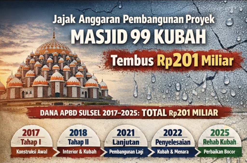 MAKASSAR, MATANUSANTARA — Pembangunan Masjid 99 Kubah Asmaul Husna di Kota Makassar sejak 2017 hingga rehabilitasi kubah 2025 menelan total anggaran APBD Sulsel sekitar Rp201 miliar, namun kondisi masjid masih bocor parah. Inspeksi DPRD Sulawesi Selatan (Sulsel) menemukan genangan air di kubah utama dan lantai, meski proyek telah menyedot miliaran rupiah dan kini menimbulkan pertanyaan publik tentang kualitas proyek.
