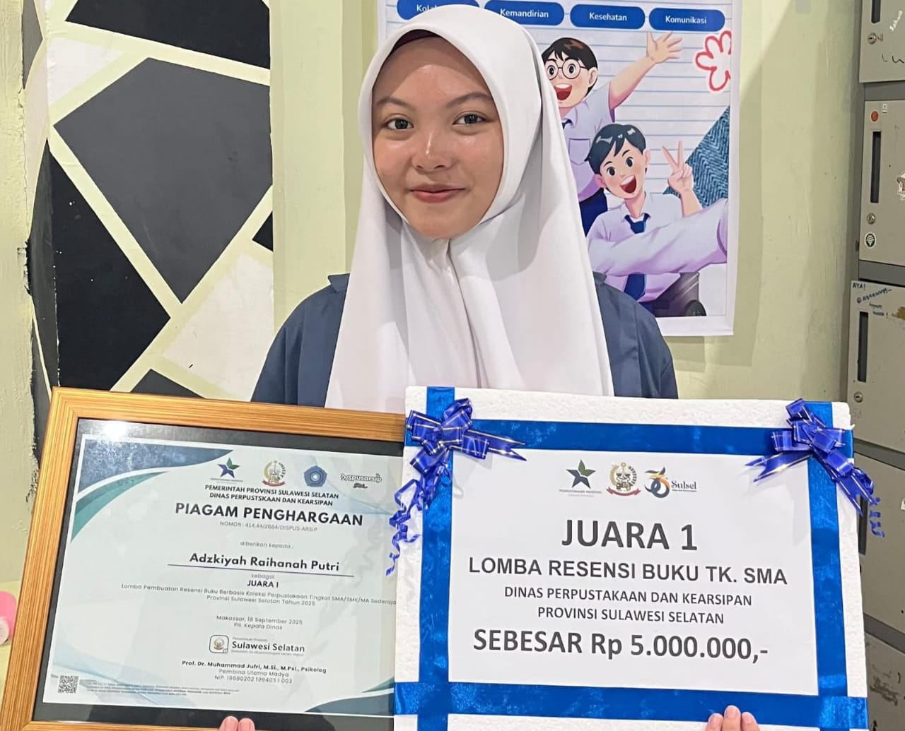 MAKASSAR, MATANUSANTARA — Kabar membanggakan datang dari SMAIT Darul Fikri Makassar. Salah satu siswinya, Ananda Adzkiyah Raihanah Putri, berhasil menorehkan prestasi gemilang dengan meraih Juara 1 Lomba Resensi Buku Tingkat SMA se-Provinsi Sulawesi Selatan (Sulsel) yang diselenggarakan oleh Dinas Perpustakaan dan Kearsipan Provinsi Sulsel.