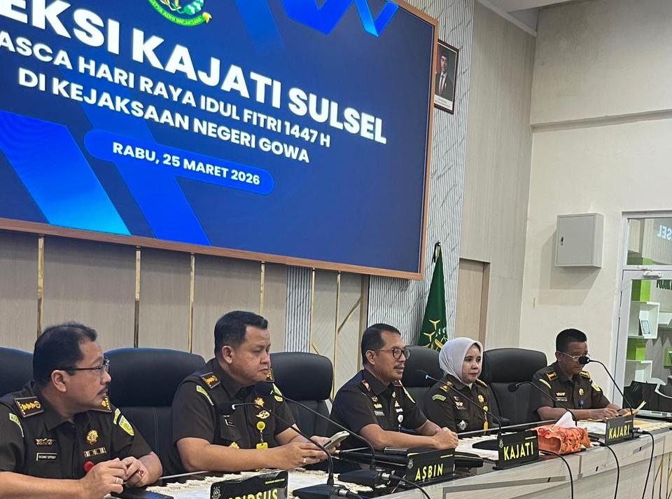 MAKASSAR, MATANUSANTARA — Hari pertama pasca libur panjang Idul Fitri 1447 H diwarnai suasana tegang di Kejaksaan Negeri (Kejari) Gowa. Kepala Kejaksaan Tinggi (Kajati) Sulawesi Selatan, Didik Farkhan, memimpin inspeksi mendadak (Sidak) yang memeriksa absensi seluruh pegawai satu per satu, Rabu (25/03/2026).