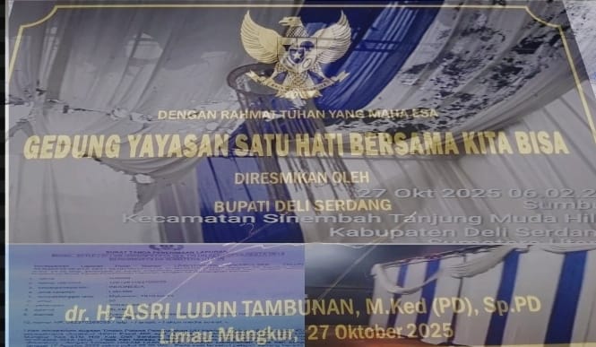 DELISERDANG, MATANUSANTARA –Bupati Deli Serdang dr. Asri Ludin Tambunan bersama istri, Jelita Tambunan selaku Ketua PKK Kabupaten Deli Serdang, secara resmi meresmikan Gedung Baru Yayasan Satu Hati Bersama Kita Bisa, Senin sore, 27 Oktober 2025. Peresmian berlangsung meriah dengan pemotongan pita dan sambutan hangat melalui tarian khas daerah.
