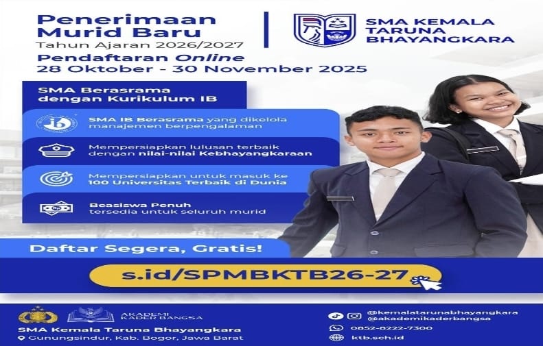 Pendaftaran dibuka mulai 28 Oktober hingga 30 November 2025, dan dilakukan secara online melalui tautan resmi s.id/SPMBKTB26-27. Proses ini terbuka bagi calon siswa dari seluruh wilayah Indonesia tanpa batasan domisili.