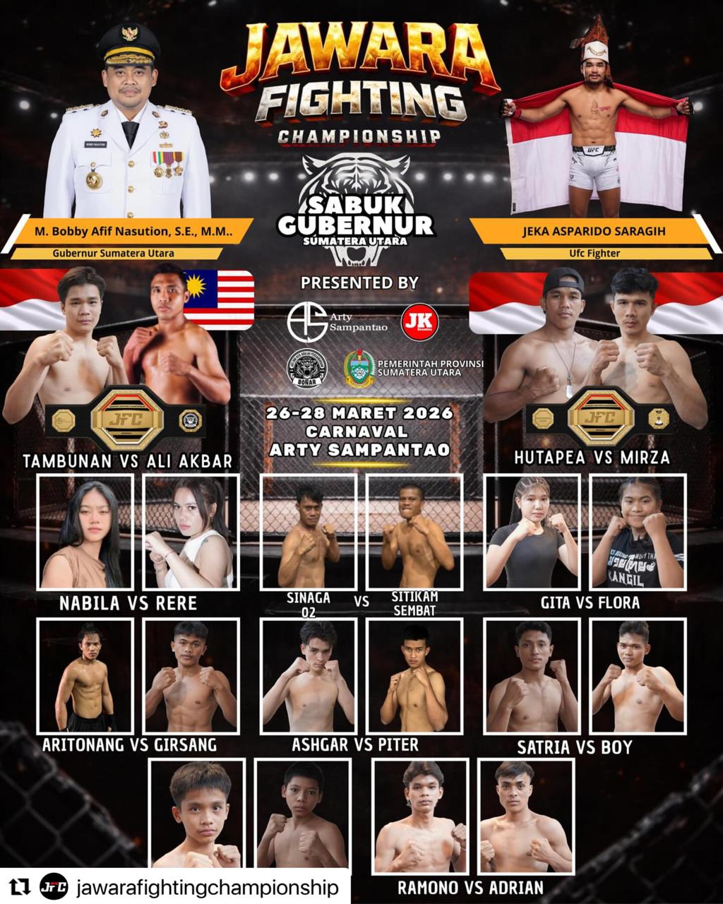 MEDAN, MATANUSANTARA – Jawara Fighting Championship (JFC) Season 2, yang diselenggarakan oleh Jeka Saragih (BONAR SIMALUNGUN), siap menghadirkan laga seru antara petarung Indonesia dan Malaysia pada tanggal 26 hingga 28 Maret 2026 di Carnaval Arty Sampantao di Stadion Kota Perdagangan Kabupaten Simalungun.
