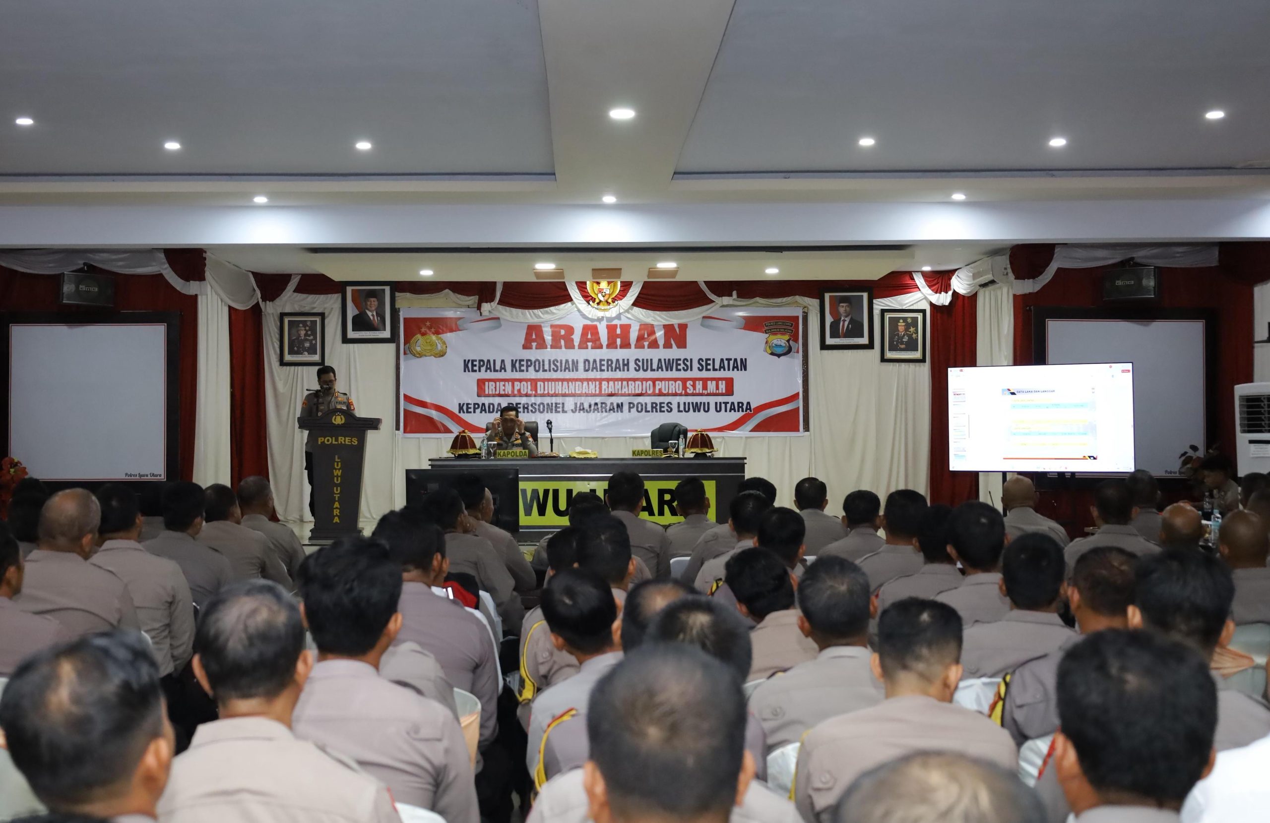 Kapolda Sulawesi Selatan saat memberikan pengarahan kepada jajaran Polres Luwu Utara, menekankan peningkatan kinerja, disiplin anggota, dan percepatan pelayanan hukum kepada masyarakat.