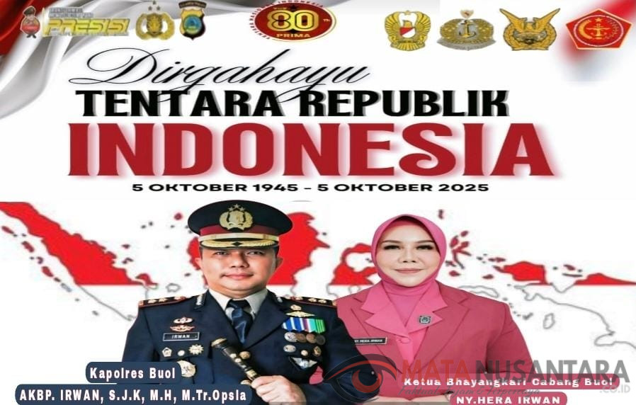 BUOL, MATANUSANTARA -– Dalam semangat memperingati Hari Ulang Tahun ke-80 Tentara Nasional Indonesia (TNI), Kapolres Buol AKBP Irwan, S.J.K., M.H., M.Tr.Opsla bersama Ketua Bhayangkari Cabang Buol Ny. Hera Irwan menyampaikan ucapan selamat dan apresiasi kepada seluruh prajurit TNI yang telah menjadi garda terdepan dalam menjaga kedaulatan dan keamanan Negara Kesatuan Republik Indonesia (NKRI) 05 Oktober 2025.