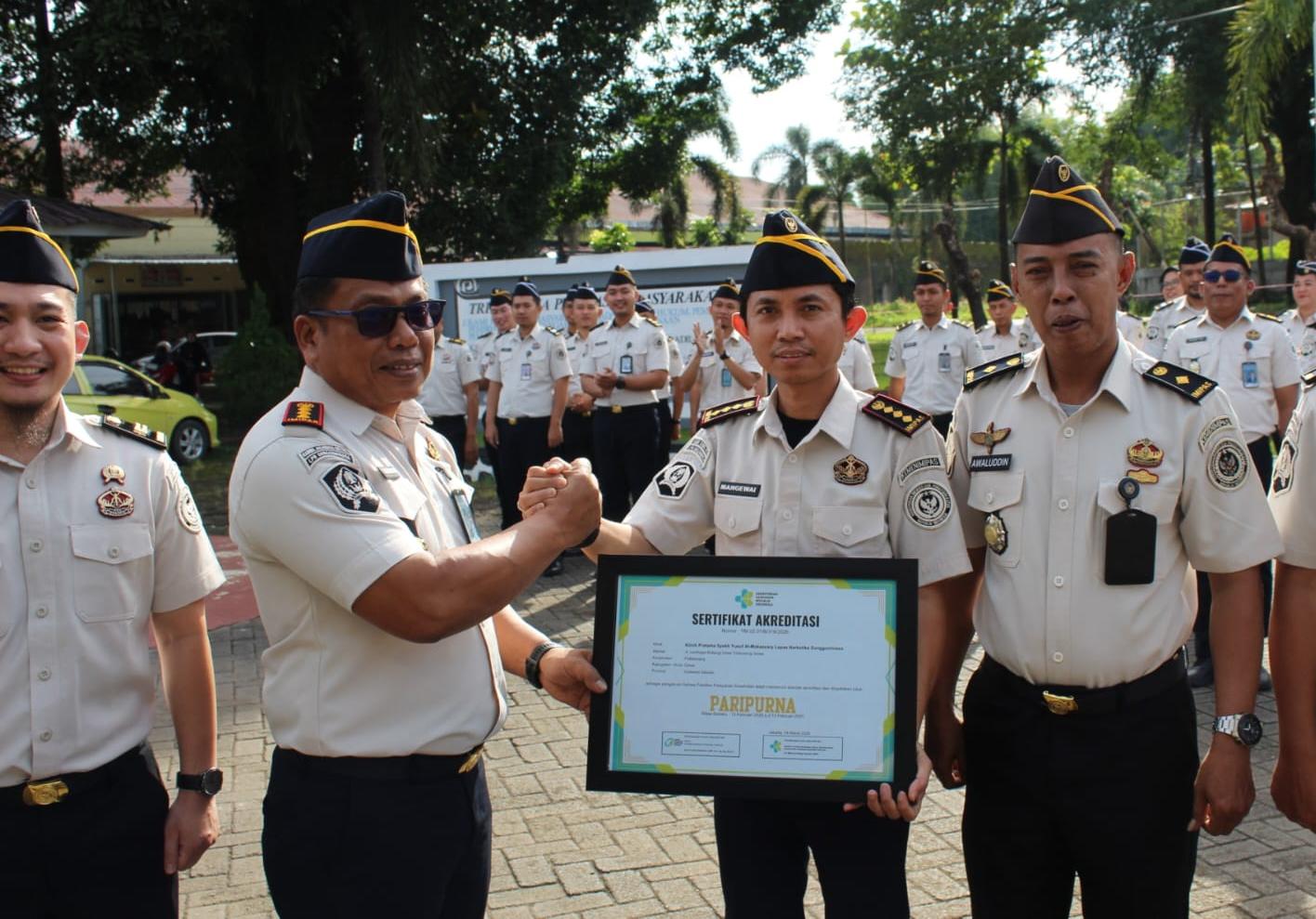 Penyerahan Sertifikat Paripurna kepada Klinik Lapas Narkotika Sungguminasa sebagai pengakuan standar layanan kesehatan tertinggi.