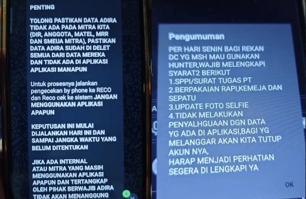 Tak hanya itu, beredar pula Pengumuman Internal (Hunter/DC) yang mewajibkan sejumlah persyaratan bagi penagih yang masih menggunakan aplikasi Hunter, mulai dari surat tugas resmi hingga larangan penyalahgunaan data.