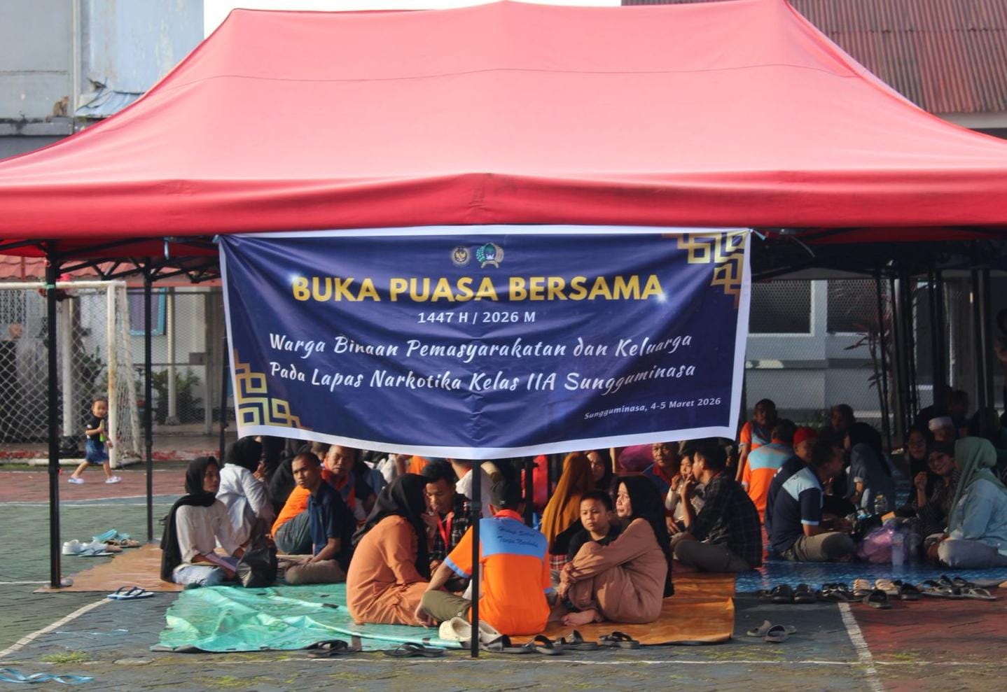 GOWA, MATANUSANTARA — Lembaga Pemasyarakatan (Lapas) Narkotika Sungguminasa memberikan hak kepada Warga Binaan Pemasyarakatan (WBP) untuk melaksanakan kegiatan buka puasa bersama keluarga di lapangan dalam area lapas, Rabu (4/3).