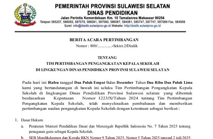 Draft berita acara pertimbangan yang ditetapkan pada 24 Desember 2025 itu sendiri memuat rencana pengisian sebanyak 65 kepala SMA, 40 kepala SMK, dan 7 kepala SLB di Sulawesi Selatan. Bocornya dokumen tersebut memunculkan dugaan adanya kepentingan terselubung dalam proses pengisian jabatan strategis di lingkungan Dinas Pendidikan Sulsel.