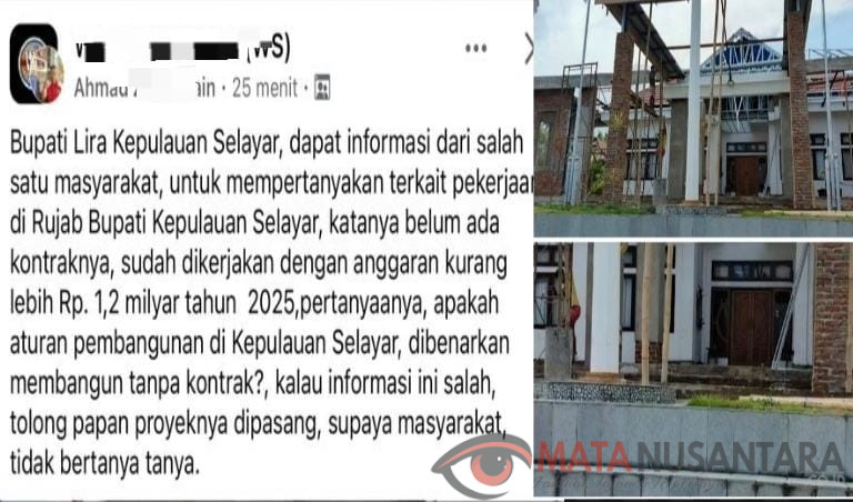 “Bupati Lira Kepulauan Selayar, dapat informasi dari masyarakat, untuk mempertanyakan pekerjaan di Rujab Bupati Selayar. Katanya belum ada kontraknya, sudah dikerjakan dengan anggaran kurang lebih Rp1,2 miliar tahun 2025. Pertanyaannya, apakah aturan pembangunan di Kepulauan Selayar membenarkan membangun tanpa kontrak? Kalau informasi ini salah, tolong papan proyeknya dipasang supaya masyarakat tidak bertanya-tanya,” tulis akun tersebut.