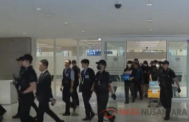Petugas Kepolisian Nasional Korea mengawal kedatangan 64 warga Korsel dari Kamboja yang terlibat kasus online scam internasional. (Dok. Yonhap/Spesial/Gooogle/ MataNusantara.co.id)
