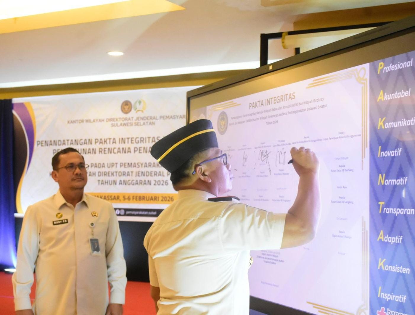 MAKASSAR, MATANUSANTARA — Penguatan integritas fiskal dan akuntabilitas anggaran kembali ditegaskan di lingkungan Pemasyarakatan Sulawesi Selatan (Sulsel). Kepala Lembaga Pemasyarakatan (Kalapas) Narkotika Kelas IIA Sungguminasa Gunawan, menghadiri langsung Penandatanganan Pakta Integritas dan Pendampingan Rencana Penarikan Dana (RPD) Tahun Anggaran 2026 yang digelar Kantor Wilayah Direktorat Jenderal Pemasyarakatan (Kanwil Ditjenpas) Sulsel di Hotel Grand Asia, Makassar, Kamis (5/2/2026).