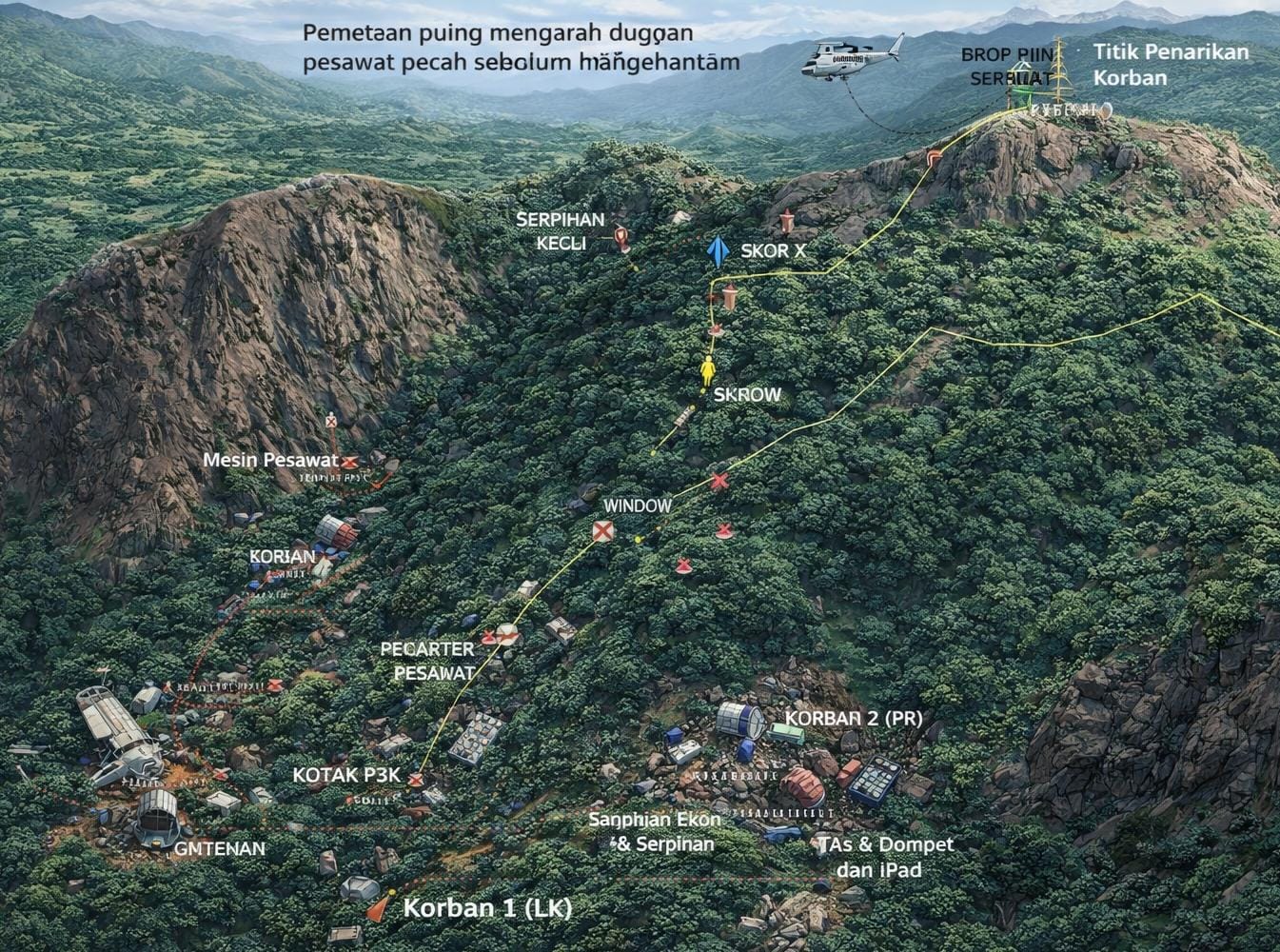 Untuk mengatasi medan ekstrem, petugas memasang z-staring di puncak Gunung Bulusaraung serta menetapkan titik drop heli dan titik penarikan korban. Langkah ini tidak hanya krusial untuk evakuasi, tetapi juga untuk mengamankan puing-puing vital yang berpotensi menjadi barang bukti utama penyebab kecelakaan.