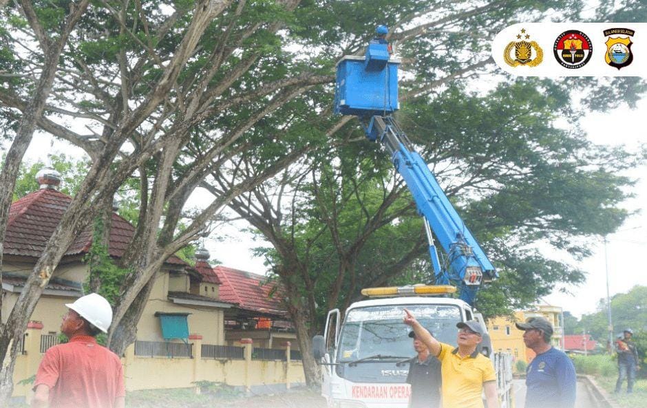 LUWU, MATANUSANTARA — Polres Luwu bersama Dinas Penerangan Jalan Umum (PJU) Kabupaten Luwu melakukan penebangan dan pemangkasan pohon yang berpotensi tumbang di jalur dua perkantoran Belopa, Jumat (28/11/2025). Kegiatan ini dilakukan sebagai langkah antisipasi menghadapi musim penghujan.