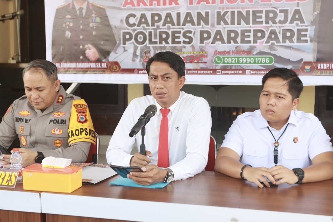 Kapolres Parepare, AKBP Indra Waspada Yuda, didampingi Kasat Reskrim Polres Parepare AKP Muhammad Agus Purwanto menyampaikan capaian kinerja pengungkapan kasus BBM subsidi dalam rilis akhir tahun 2025 di Mapolres Parepare.