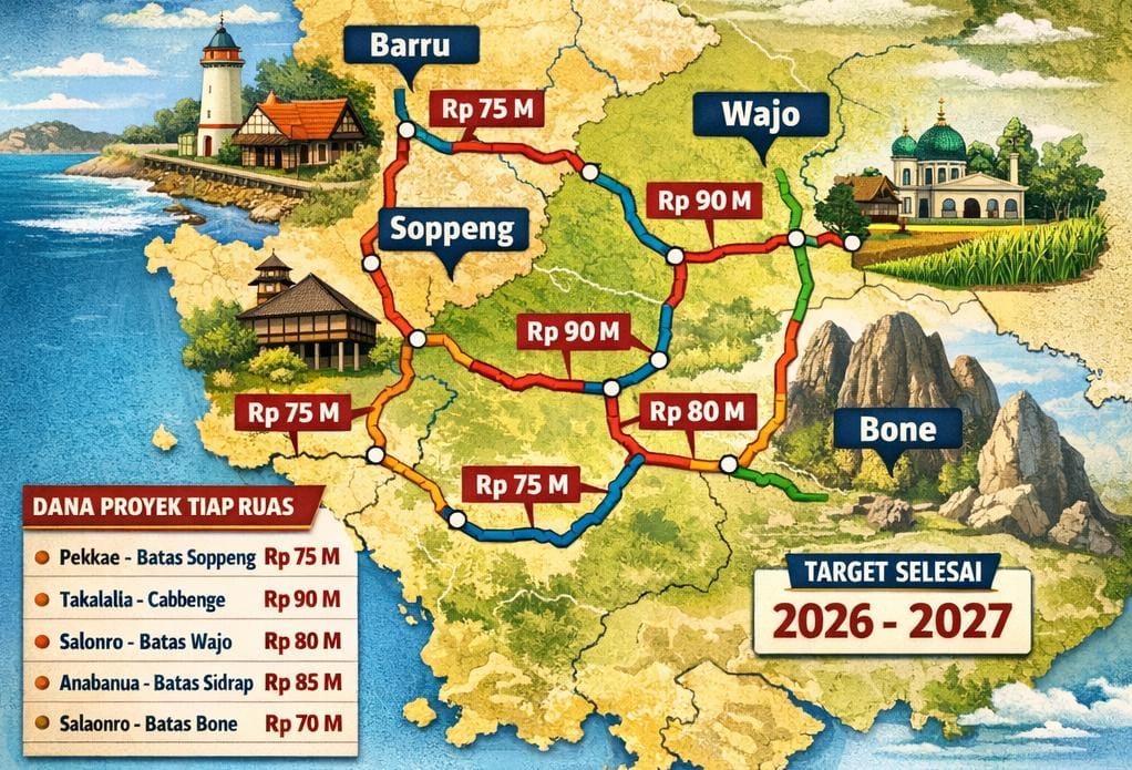 MAKASSAR, MATANUSANTARA — Pemerintah Provinsi Sulawesi Selatan (Sulsel) resmi menancapkan tonggak pembangunan jalan strategis sepanjang 286 kilometer, menghubungkan lima kabupaten: Barru, Soppeng, Wajo, Sidrap, dan Bone. Proyek Paket IV ini menggunakan skema Multi Years Contract (MYC) dengan total anggaran Rp615 miliar, dijadwalkan rampung secara bertahap pada tahun anggaran 2026–2027. Groundbreaking berlangsung di Kabupaten Wajo, Selasa (23/12/2025).