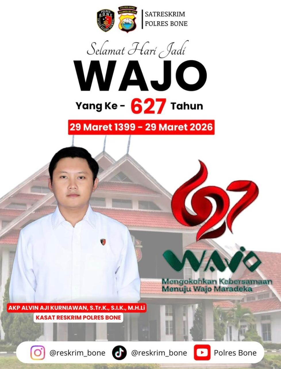 BONE, MATANUSANTARA — Satuan Reserse Kriminal (Satreskrim) Polres Bone turut memberikan ucapan selamat Hari Jadi Kabupaten Wajo yang ke-627 tahun. Ucapan tersebut disampaikan sebagai bentuk penghormatan terhadap sejarah panjang Wajo sekaligus dukungan terhadap semangat kebersamaan dalam pembangunan daerah.