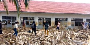 “Kami kekurangan personel untuk membersihkan sekolah. Bantuan relawan sangat kami harapkan agar kegiatan belajar bisa kembali normal,” ujarnya.