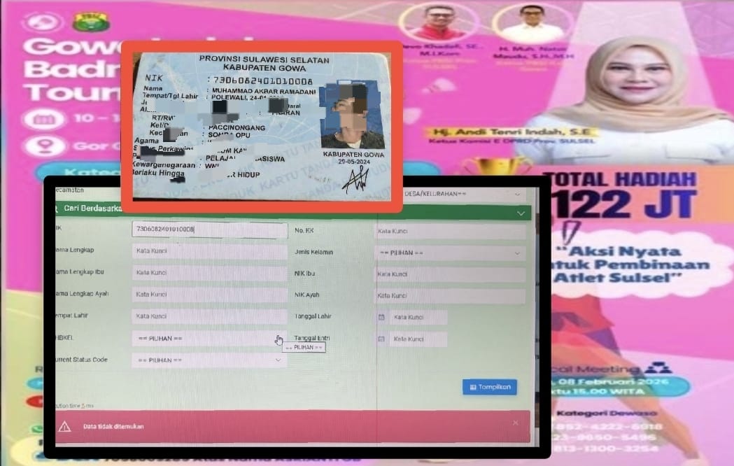 GOWA, MATANUSANTAR – Kontroversi mencuat di Gowa Indah Badminton Open Tournament 2026 setelah salah satu peserta Kelas D diduga menggunakan Kartu Tanda Penduduk (KTP) palsu untuk mendaftar. Turnamen bergengsi yang berlangsung sejak 10 hingga 14 Februari 2026 di GOR Gowa Sungguminasa kini menghadapi sorotan serius menjelang babak final.