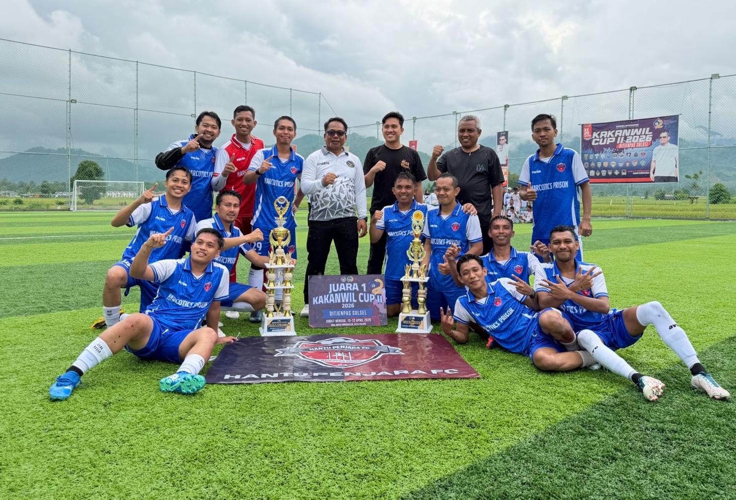 Penyerahan trofi dilakukan langsung oleh Kakanwil, termasuk piala bergilir Kakanwil Cup II Tahun 2026 yang resmi menjadi milik Lapas Narkotika Sungguminasa untuk tahun ini.